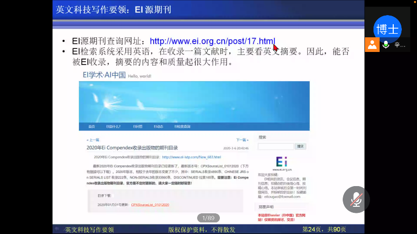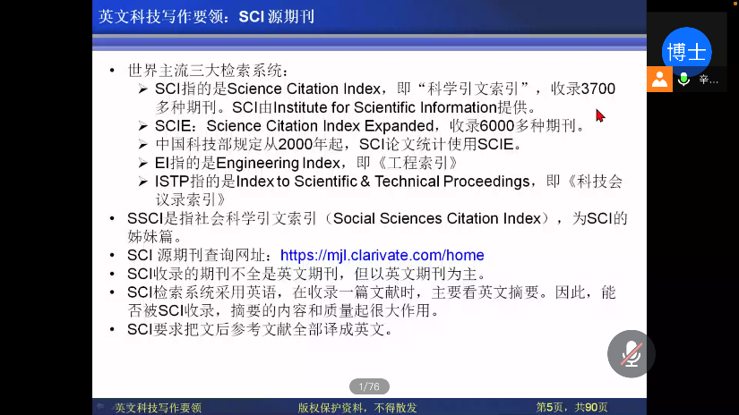 講座中辛教授詳細的為大家介紹了何為SCI源期刊以及期刊分區的依據,并推薦了分區以及影響因子查詢神器“中國科學院文獻情報中心“(微信小程序)來幫助大家快速了解各個期刊具體狀況。接著教授講到ESI這一概念,ESI是目前普遍使用于衡量學科研究績效、跟蹤學科發展趨勢的分析評價工具,并借此鼓勵同學發表高水平SCI論文。講到EI源期刊板塊時,辛教授強調英文摘要的質量好壞對是否錄用起到很大作用并為我們推薦了眾多選刊工具如Google Scholar、LetPub、小木蟲、丁香園等。