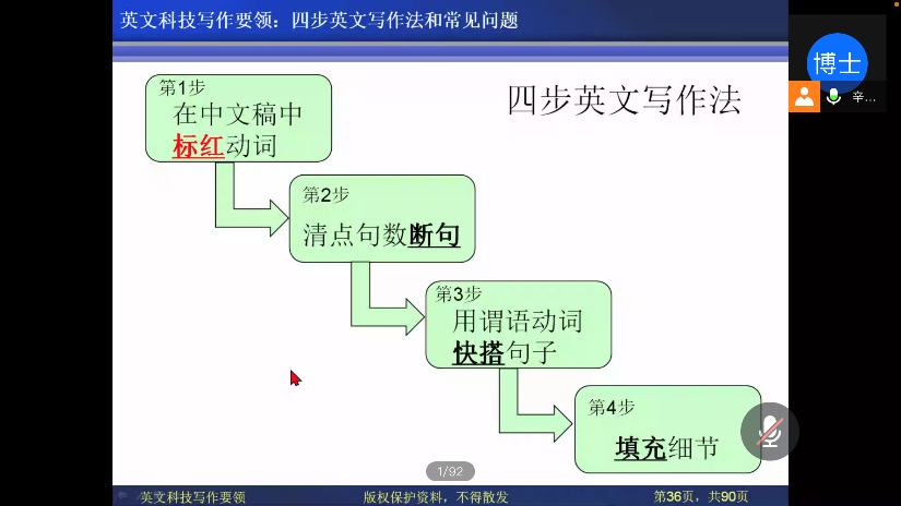 講座最后,辛教授提出自己的四步英文寫作法,并結合同學的論文現場修改幫助同學理解掌握方法。四步英文寫作法中教授詳細的為大家講解每一步的要點以及注意事項,總的概括為4個注意:1.注意內容分段、寫作風格、句子結構清晰、邏輯完整。2.注意用詞妥當和時態語態正確。3.注意避免語法和語序錯誤。4.注意標點符號細節等規范。