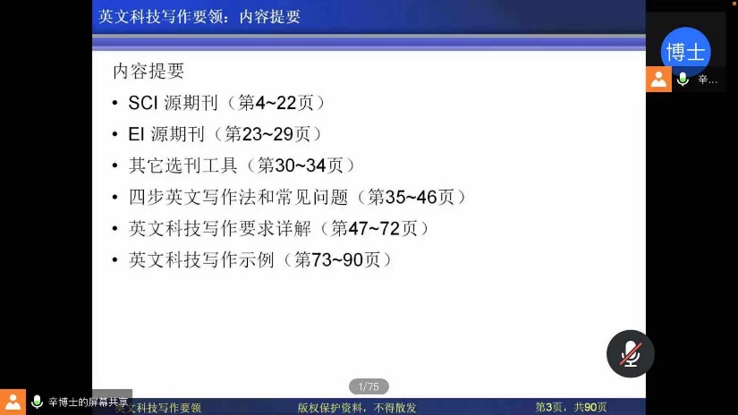 講座開篇,辛教授指出當代大學生英文寫作水平不夠,獨立完成英文科技文獻寫作困難等問題,并對癥下藥從最基礎的源期刊講起,承接選刊工具介紹,引出四步英文寫作法以及常見問題,最后結合同學的論文加以修改以便學生學以致用。