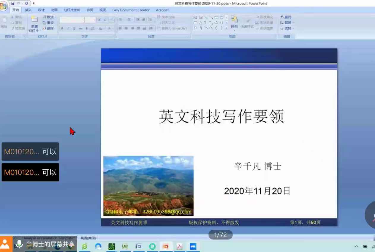 為了提高研究生英文科技寫作能力,幫助其發表高水平英文論文、增強國際交流能力,2020年11月20日上午,我院誠邀2020年上海工程技術大學海外名師項目獲得者辛千凡教授線上開展題為“Key Techniques of English Scientific Writing(英文科技寫作要領)”的主題講座,有近300名研究生參與講座。辛教授于美國華盛頓大學獲得機械工程碩士、博士學位,現擔任美國HXK技術公司主管,英文底蘊深厚,寫作技巧精湛。