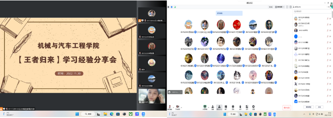 In order to further promote the construction of an excellent style of study, strengthen the sense of gratitude of the subsidized students, and give full play to the exemplary and leading role of outstanding students, on November 30, the College of Mechanical and Automotive Engineering held an online learning experience sharing meeting on the return of the king. The sharing meeting was hosted by Li Kuo, the college affairs counselor, and was attended by representatives of the college's national scholarships, Shanghai scholarship winners and 2022 freshmen.