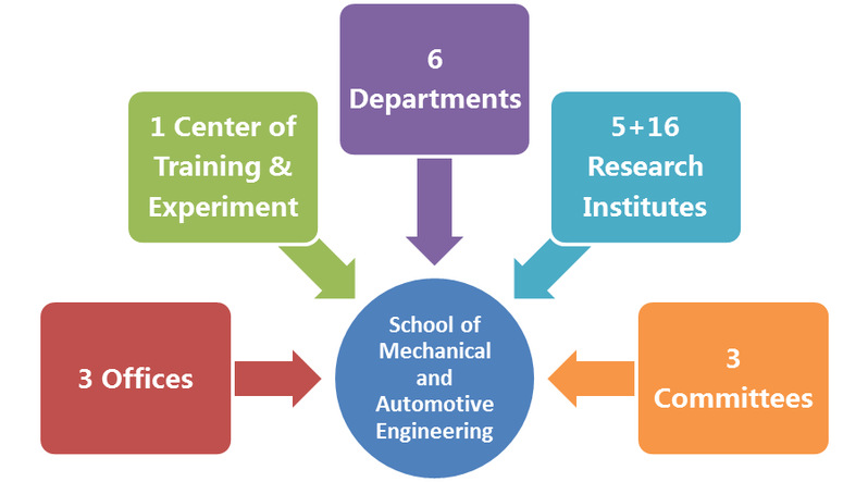 • The school presently has six departments: Dept. of Mechanical Design, Dept. of Mechanical Manufacturing, Dept. of Mechatronic Engineering, Dept. of Energy and Power Engineering, Dept. of Automotive Engineering and Dept. of Automotive Service Engineering.