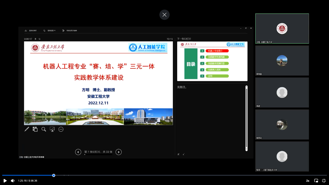 安徽工程大學機械工程學院(人工智能學院)方明副教授報告的題目為《機器人工程專業“賽、培、學”三元一體實踐教學體系建設》,他詳細介紹了安徽工程大學機器人工程專業實踐教學體系的構建、實踐教學資源的打造以及實踐育人的成效等,充分說明了實踐教學在機器人工程專業課程體系中的重要性。