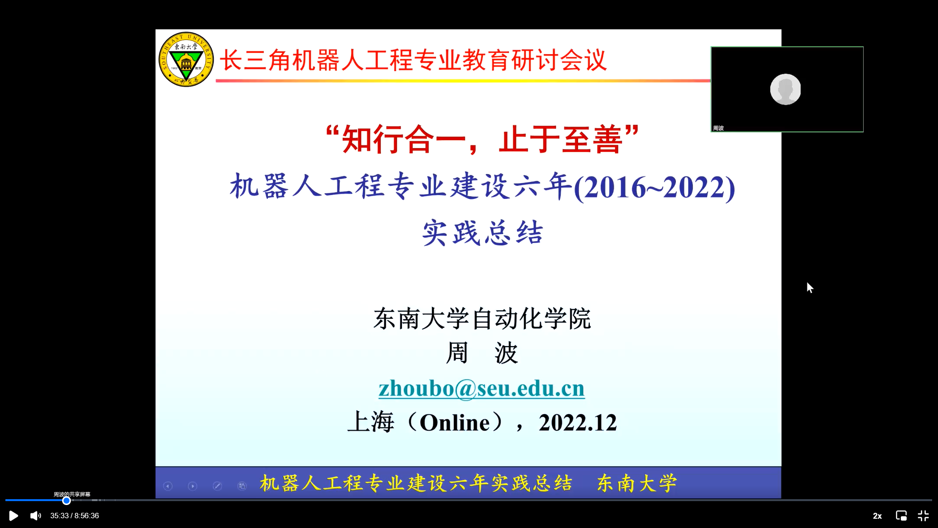 全國首家設立機器人工程本科專業的東南大學自動化學院機器人工程系主任周波副教授做了“知行合一,止于至善”《機器人工程專業建設六年(2016-2022)》實踐總結報告。他講述了機器人工程專業建設的需要與挑戰,回顧了國內外機器人工程專業的現狀,以及東南大學機器人工程專業建設取得的進展,最后總結機器人工程專業建設中存在問題以及一些思考。